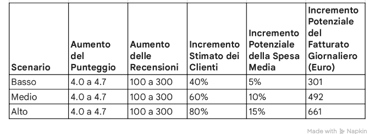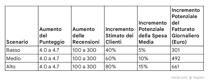 Questo rapporto analizza il potenziale incremento di fatturato giornaliero per un ristorante che registra un miglioramento del suo punteggio medio su Google Maps da 4.0 a 4.7 stelle e un aumento del numero di recensioni da 100 a 300, partendo da un incasso giornaliero attuale di 700 euro. L'analisi, basata su studi esistenti che correlano le recensioni online con la performance dei ristoranti, suggerisce che un tale miglioramento può portare a un incremento significativo sia nel numero di clienti che nella loro spesa media, con un potenziale aumento del fatturato giornaliero stimato tra i 300 e i 660 euro.