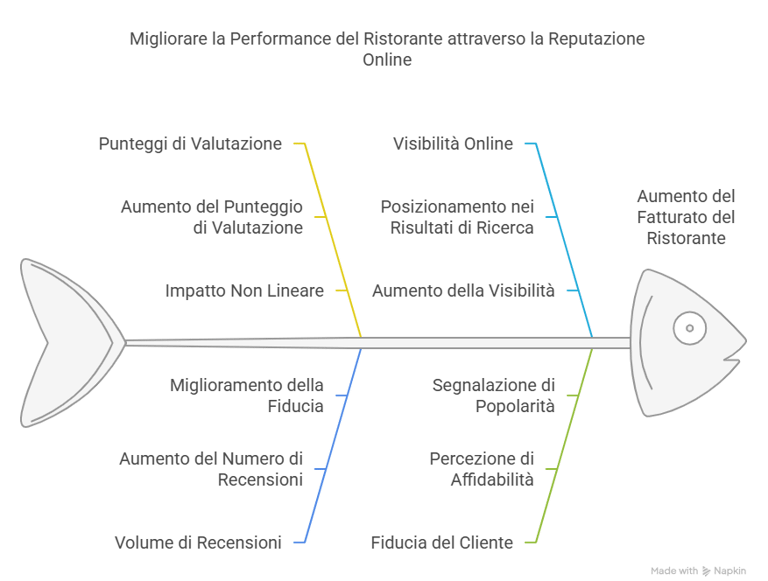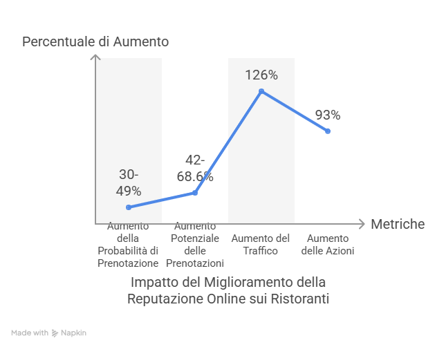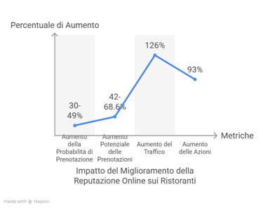 Un miglioramento del punteggio di valutazione può influenzare notevolmente la probabilità che un cliente scelga un determinato ristorante. Un aumento di mezza stella nella valutazione di un ristorante su piattaforme di recensioni ha dimostrato di aumentare la probabilità che sia completamente prenotato nelle ore di punta dal 30% al 49%. Estrapolando questi dati, un aumento di 0.7 stelle potrebbe portare a un potenziale incremento di prenotazioni (e quindi di clienti) compreso tra il 42% e il 68.6%, specialmente durante gli orari di punta. Inoltre, le attività che compaiono nel "Local Pack" di Google (i primi tre risultati) tendono a ottenere un aumento del traffico del 126% e un incremento delle "azioni" (come clic sul sito web, richieste di indicazioni stradali) del 93% rispetto alle attività classificate tra la quarta e la decima posizione. Il miglioramento della valutazione e del numero di recensioni aumenterà la probabilità che il ristorante si posizioni più in alto nel Local Pack, portando a un sostanziale aumento del traffico e dell'interazione dei clienti.