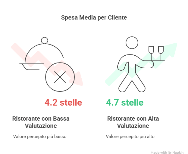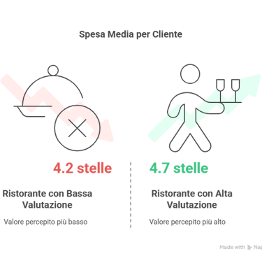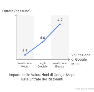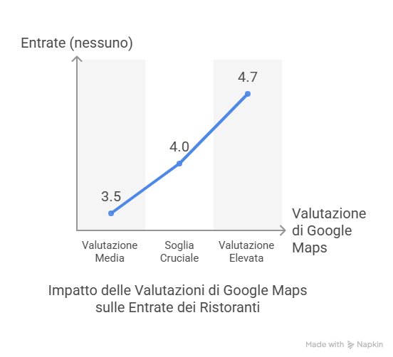 Diverse ricerche hanno correlato i punteggi su Google Maps e il numero di recensioni con il fatturato dei ristoranti. Un aumento di un punto nella valutazione online di un'attività può portare a un incremento del fatturato compreso tra il 5% e il 9%. Nello specifico per i ristoranti indipendenti, un aumento di 0.5 stelle nella valutazione media su piattaforme come Yelp (spesso comparabile a Google Maps) è stato associato a un aumento del fatturato del 9%. Estrapolando questi dati, un miglioramento di 0.7 stelle, da 4.0 a 4.7, potrebbe conservativamente tradursi in un aumento del fatturato compreso tra il 3.5% e il 6.3%, o potenzialmente superiore, considerando l'impatto non lineare del superamento di specifiche soglie di valutazione.