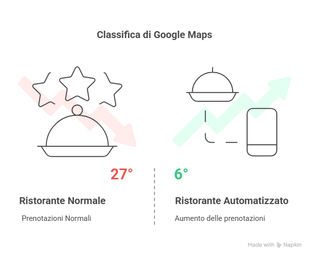 Un punteggio più alto su Google Maps e un maggior numero di recensioni positive possono portare a un tasso di conversione più elevato da visualizzazioni a clienti effettivi. Un aumento del punteggio di valutazione può incrementare significativamente le percentuali di clic sulla scheda del ristorante nei risultati di ricerca di Google Maps. Una maggiore fiducia e credibilità, derivanti da recensioni positive e numerose, rendono i potenziali clienti più propensi a scegliere il ristorante. Questo può tradursi in una maggiore percentuale di utenti che, dopo aver visualizzato la scheda del ristorante, decidono di prenotare un tavolo o visitare il locale.